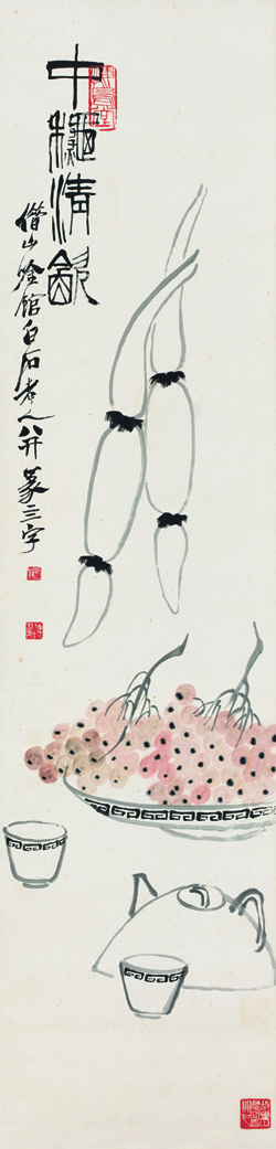 1917年仲夏,正逢護(hù)法運(yùn)動(dòng)興起,湘南兵荒馬亂,齊白石只身赴京以避匪患。初到北京,幾經(jīng)輾轉(zhuǎn),齊白石寓居法源寺,以賣畫治印為生。此時(shí)的齊白石醉心于八大山人,冷逸有余,富貴不足,因此作品少人問(wèn)津。不久后,當(dāng)時(shí)已屬京華畫壇領(lǐng)袖的陳師曾走訪法源寺,諫言齊白石不必求俗媚世,應(yīng)沖破藩籬,自創(chuàng)風(fēng)格。年逾五旬的齊老聽取了陳師曾的勸言,開始自己的“衰年變法”。