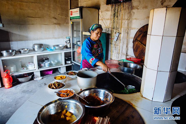 湖南湘西州花垣縣雙龍鎮(zhèn)十八洞村村民龍興花在自家的農家樂為客人準備飯菜(9月7日攝)。 新華社記者 朱煒 攝