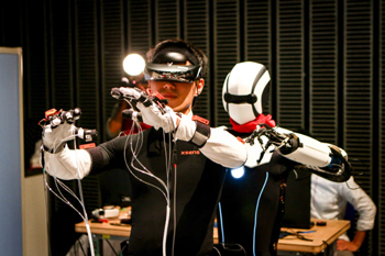 ??? 日本移動(dòng)通信運(yùn)營商都科摩通信公司11月8日在日本科學(xué)未來館展示基于5G的應(yīng)用場景。圖為工作人員為觀眾展示遠(yuǎn)程支援機(jī)器人?;?G技術(shù),工作人員的動(dòng)作可以迅速傳遞到機(jī)器人端,使機(jī)器人做出和工作人員完全一致的動(dòng)作。記者 馬曹冉 攝 |