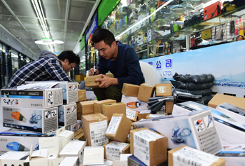 ??? “雙11”臨近,浙江義烏國際商貿(mào)城的工作人員忙著接單、打包,為即將到來的網(wǎng)購熱潮積極備戰(zhàn)。圖為11月8日,商家工作人員為包裹貼上快遞單。新華社發(fā)(龔獻(xiàn)明 攝) |