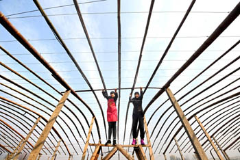 ??? 11月7日,山東省沂源縣東沙溝村的農(nóng)民在搭建蔬菜大棚。當(dāng)日是二十四節(jié)氣中的立冬,各地農(nóng)民搶抓農(nóng)時(shí)做好采收、播種、御寒管理等工作,田間地頭一派繁忙。新華社發(fā)(趙東山 攝) |