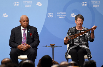 ??? 11月6日,新一輪聯(lián)合國氣候變化會(huì)議在德國波恩開幕。面對(duì)氣候變化給人類帶來的切實(shí)威脅,更加緊密的國際合作、更加切實(shí)的減排努力,顯得比以往任何時(shí)候都更加迫在眉睫。圖為《聯(lián)合國氣候變化框架公約》第23次締約方大會(huì)主席國斐濟(jì)總理姆拜尼馬拉馬(左)與德國環(huán)境部長芭芭拉·亨德里克斯出席大會(huì)開幕式。新華社/法新 |