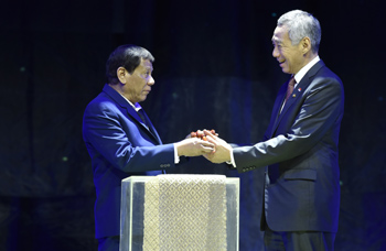 ??? 第31屆東盟峰會(huì)及東亞合作領(lǐng)導(dǎo)人系列會(huì)議11月14日晚間在菲律賓首都馬尼拉閉幕,新加坡將為明年?yáng)|盟輪值主席國(guó)。圖為菲律賓總統(tǒng)杜特爾特(左)在閉幕儀式上將象征東盟輪值主席國(guó)身份的木槌交給新加坡總理李顯龍。新華社發(fā)(王璽 攝) |