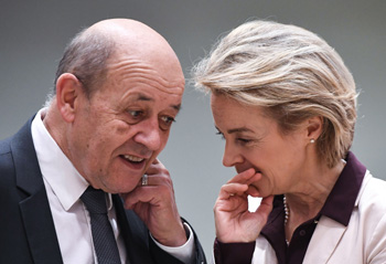 ??? 23個(gè)歐盟國(guó)家的外交和國(guó)防部長(zhǎng)11月13日在歐盟外長(zhǎng)理事會(huì)期間簽署了一項(xiàng)聯(lián)合協(xié)議,達(dá)成在防務(wù)領(lǐng)域的“永久結(jié)構(gòu)性合作”。圖為法國(guó)外交部長(zhǎng)勒德里昂(左)和德國(guó)國(guó)防部長(zhǎng)馮德萊恩在會(huì)議期間交談。新華社/法新 |