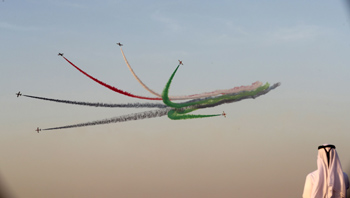 ??? 11月14日,在阿聯(lián)酋迪拜舉行的國(guó)際航空展上,阿聯(lián)酋“騎士”飛行表演隊(duì)進(jìn)行特技飛行表演。新華社/法新 |