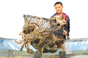 ??? 11月14日,在江蘇省盱眙縣“鮑貢蟹”養(yǎng)殖基地,養(yǎng)殖戶喻剛在捕撈“鮑貢蟹”。近日,江蘇省淮安市盱眙縣培育的特色螃蟹“鮑貢蟹”大批量上市。自2008年以來,盱眙縣依托洪澤湖優(yōu)質(zhì)的水資源,鼓勵(lì)養(yǎng)殖戶和合作社規(guī)?;?、品牌化養(yǎng)殖優(yōu)質(zhì)螃蟹?!磅U貢蟹”是當(dāng)?shù)夭扇 巴斗判访缟佟⑺轂轱暳稀钡淖匀火B(yǎng)殖模式養(yǎng)殖而成的特色螃蟹,具有青殼白肚、金爪黃毛、個(gè)體肥大、肉質(zhì)鮮美等特點(diǎn)。目前,盱眙縣“鮑貢蟹”養(yǎng)殖面積已達(dá)5萬(wàn)畝。新華社發(fā)(周海軍 攝) |