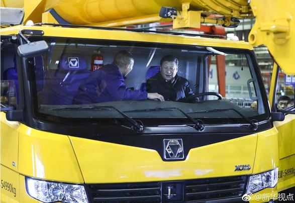 正在徐工集團考察的習近平,坐進剛下線的XCA220型全地面起重機駕駛室,向技術人員詳細詢問起重機的性能、產量、價格等。