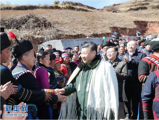 三河村平均海拔2500多米,是一個彝族貧困村。習近平沿著石板小路步行進村,察看村容村貌和周邊自然環(huán)境。他先后走進村民吉好也求、節(jié)列俄阿木2戶貧困家庭看望,詳細觀看門前的扶貧聯(lián)系卡,同主人親切拉家常,詢問生活過得怎么樣,發(fā)展什么產(chǎn)業(yè),收入有多少,孩子有沒有學上。他饒有興趣地聽10歲小女孩吉好有果唱《國旗國旗真美麗》,并帶頭鼓掌。在村民節(jié)列俄阿木家,習近平同村民代表、駐村扶貧工作隊員圍坐在火塘邊,一起分析當?shù)刎毨Оl(fā)生的原因,謀劃精準脫貧之策。大家用樸實生動的語言表達了見到總書記的喜悅和幸福,暢敘了黨和政府對彝族同胞的關懷關愛,述說了脫貧攻堅行動給鄉(xiāng)親們帶來的大量實惠,人人都邊說邊激動得流淚。習近平飽含深情地說,我一直牽掛著彝族群眾,很高興來到這里,看到大家日子一天天好起來,心里十分欣慰。得知近年來村里大力發(fā)展種養(yǎng)業(yè),引進優(yōu)良品種的牛豬羊,家家戶戶種植了馬鈴薯、核桃、花椒,農(nóng)民收入持續(xù)增加,習近平十分高興。他強調(diào),發(fā)展特色產(chǎn)業(yè)、長期穩(wěn)定致富,都需要人才。要培養(yǎng)本地人才,引導廣大村民學文化、學技能,提高本領,還要移風易俗,通過辛勤勞動脫貧致富。習近平指出,我們搞社會主義,就是要讓各族人民都過上幸福美好的生活。全面建成小康社會最艱巨最繁重的任務在貧困地區(qū),特別是在深度貧困地區(qū),無論這塊硬骨頭有多硬都必須啃下,無論這場攻堅戰(zhàn)有多難打都必須打贏,全面小康路上不能忘記每一個民族、每一個家庭。