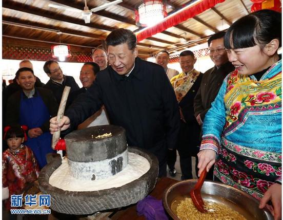 這是2月12日上午,習近平在阿壩藏族羌族自治州汶川縣映秀鎮(zhèn)考察時同居民群眾一起磨豆花。 新華社記者 鞠鵬 攝