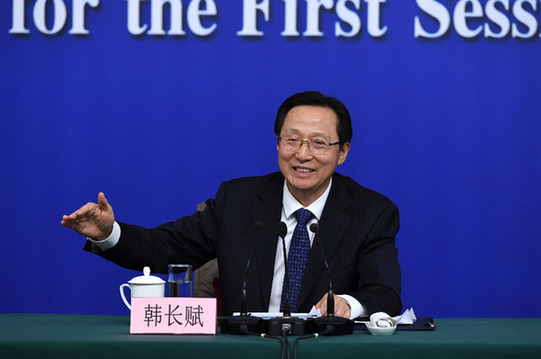 3月7日,十三屆全國(guó)人大一次會(huì)議新聞中心舉行記者會(huì)。農(nóng)業(yè)部部長(zhǎng)韓長(zhǎng)賦等就“實(shí)施鄉(xiāng)村振興戰(zhàn)略 推動(dòng)農(nóng)業(yè)轉(zhuǎn)型升級(jí)”答記者問(wèn)。新華社記者 申宏 攝