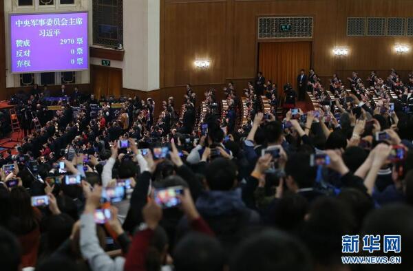 3月17日,十三屆全國人大一次會(huì)議在北京人民大會(huì)堂舉行第五次全體會(huì)議。習(xí)近平全票當(dāng)選為國家主席、中央軍委主席。 新華社記者 金立旺 攝