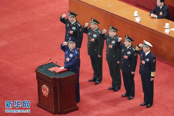 根據(jù)大會(huì)主席團(tuán)關(guān)于憲法宣誓的組織辦法,全體會(huì)議各項(xiàng)議程進(jìn)行完畢后,國(guó)務(wù)院總理李克強(qiáng)、國(guó)家監(jiān)察委員會(huì)主任楊曉渡、最高人民法院院長(zhǎng)周強(qiáng)、最高人民檢察院檢察長(zhǎng)張軍,分別進(jìn)行了憲法宣誓;中央軍委副主席、委員,全國(guó)人大常委會(huì)委員,分別進(jìn)行了集體宣誓。