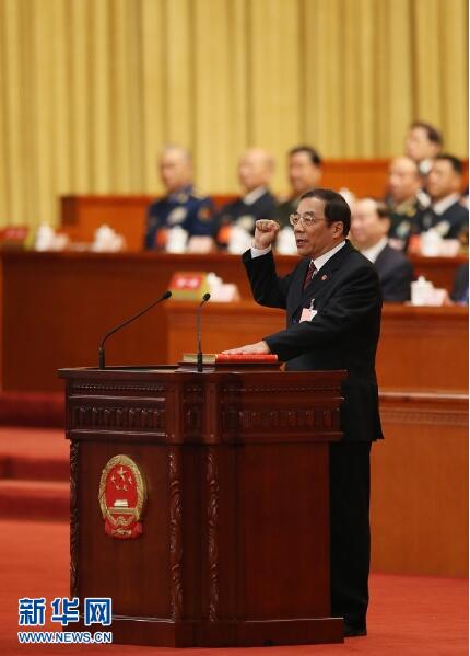 3月18日,十三屆全國(guó)人大一次會(huì)議在北京人民大會(huì)堂舉行第六次全體會(huì)議。周強(qiáng)當(dāng)選為最高人民法院院長(zhǎng)。這是周強(qiáng)進(jìn)行憲法宣誓。新華社記者 姚大偉 攝