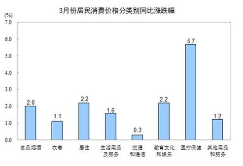2018年3月份,全國居民消費價格同比上漲2.1%。其中,城市上漲2.1%,農(nóng)村上漲1.9%;食品價格上漲2.1%,非食品價格上漲2.1%;消費品價格上漲1.6%,服務(wù)價格上漲2.8%。一季度,全國居民消費價格總水平比去年同期上漲2.1%。