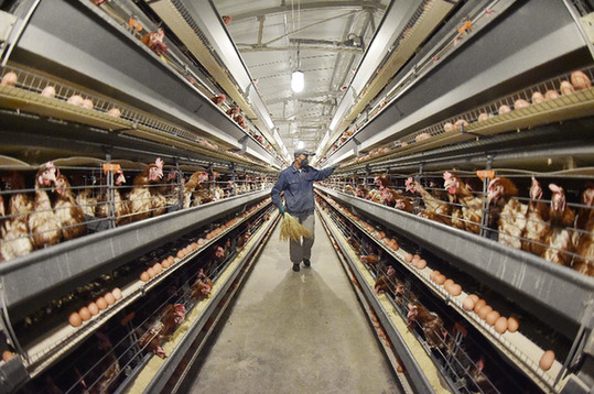 經(jīng)過數(shù)道“關(guān)卡”消毒,記者才進(jìn)入蛋雞養(yǎng)殖區(qū)域,看到所有雞舍均經(jīng)過密閉化處理,與外界人員嚴(yán)格隔離,雞舍內(nèi)采用德國進(jìn)口智能化飼養(yǎng)設(shè)備,并有自動調(diào)控溫度、濕度、空氣的內(nèi)控系統(tǒng)。3條自動傳送帶將雞蛋、雞糞、飼料分離傳送,自動化蛋品揀選設(shè)備對每一枚雞蛋進(jìn)行檢測、殺菌、噴碼和分級處理,雞糞則通過地下輸糞帶送入發(fā)酵處理系統(tǒng)。