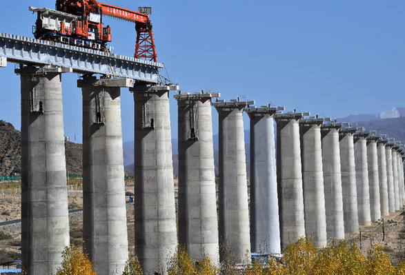 近日,川藏鐵路拉薩至林芝段昌果特大橋開始鋪設行軌排、架設梁片,標志著川藏鐵路拉林段正式進入鋪軌階段。記者 覺果 攝