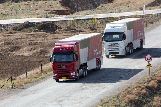 正在進(jìn)行測(cè)試的解放牌智能重型卡車。(資料照片)