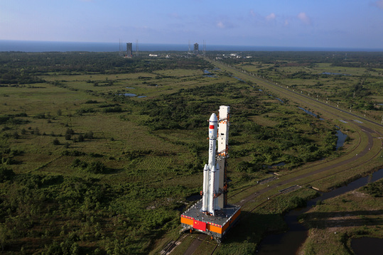 2017年4月17日,長(zhǎng)征七號(hào)遙二任務(wù)火箭完成發(fā)射場(chǎng)總裝正在轉(zhuǎn)場(chǎng)。(資料照片)