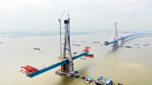 5月8日,由中鐵大橋局承建的滬通長(zhǎng)江大橋南主塔29號(hào)墩高度突破300米,達(dá)305.5米,預(yù)計(jì)7月封頂。新華社發(fā)(許叢軍 攝)