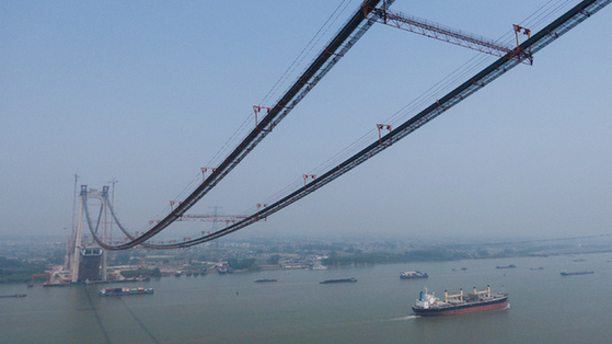 5月10日,中鐵大橋局承建的連(云港)鎮(zhèn)(江)鐵路五峰山長(zhǎng)江大橋704根主纜索股全部架設(shè)到位,標(biāo)志著我國(guó)首座公鐵兩用懸索橋主纜架設(shè)完成。記者 李響 攝