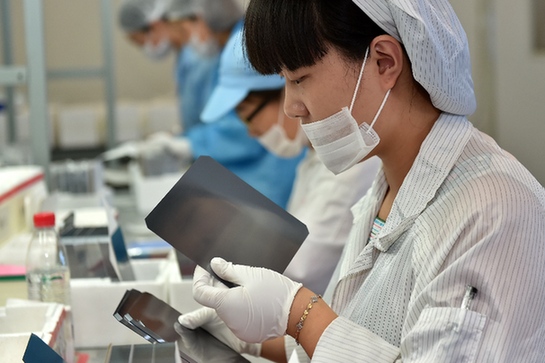 潞安集團太陽能科技有限責(zé)任公司的工人在對硅片外觀進行檢測。記者 曹陽 攝
