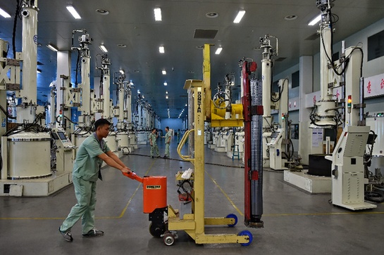 潞安集團太陽能科技有限責(zé)任公司的單晶拉制工人在搬運剛剛生產(chǎn)的單晶硅棒。記者 曹陽 攝