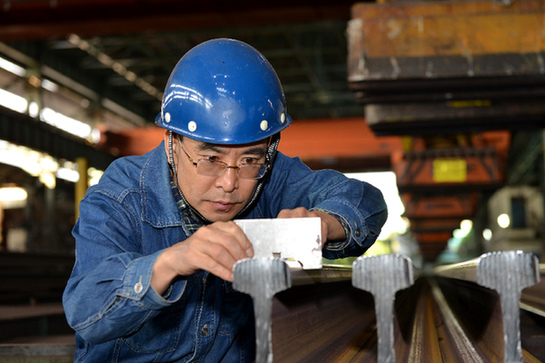 攀鋼工程師陶功明在檢查百米鋼軌質(zhì)量。何仁江 攝