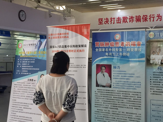 北京大學(xué)首鋼醫(yī)院門診部大廳內(nèi)的“4+7”政策宣傳展板/ 鄧睿攝