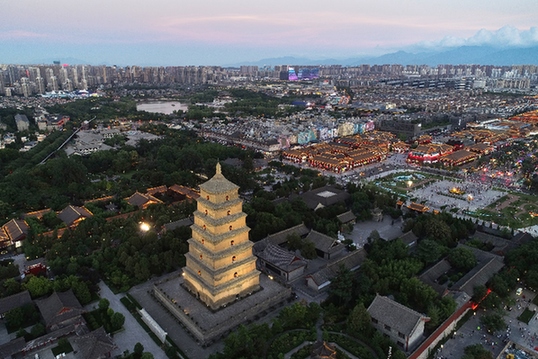 ??? 圖為盛夏時(shí)節(jié)日暮時(shí)分的西安大雁塔與大唐不夜城景區(qū),吸引眾多游人前來(lái)一覽勝景。記者 邵瑞 攝