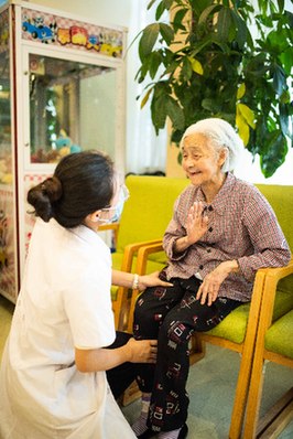 在成都一家養(yǎng)老公寓,醫(yī)護(hù)人員在與老人聊天。張可凡 攝