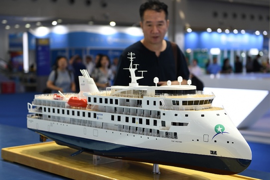 近日,2019中國(guó)海洋經(jīng)濟(jì)博覽會(huì)在深圳開(kāi)幕,觀(guān)眾在招商局展臺(tái)了解首艘國(guó)產(chǎn)極地探險(xiǎn)郵輪“格雷格·莫蒂默”號(hào)。(記者 毛思倩 攝)