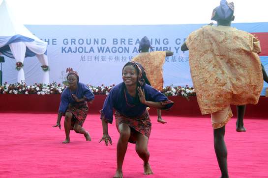 中國土木工程集團有限公司(中土集團)投資建設的尼日利亞首個鐵路車輛組裝廠9日在尼西南部奧貢州卡焦拉鎮(zhèn)舉行奠基儀式。圖為在尼日利亞奧貢州卡焦拉鎮(zhèn),當?shù)匮輪T在奠基儀式上表演傳統(tǒng)舞蹈。