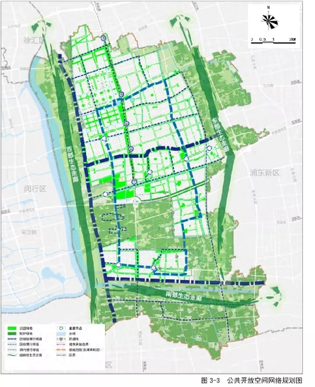 規(guī)劃以浦江郊野公園、浦閔郊野公園兩大片區(qū)為生態(tài)綠心,以西、南、東三大生態(tài)帶為結(jié)構(gòu)要素,向鎮(zhèn)域內(nèi)部延伸,通過(guò)濱水、沿路的綠道串聯(lián)次級(jí)公共活動(dòng)節(jié)點(diǎn), 形成層級(jí)分明、覆蓋完善的公共開(kāi)放空間網(wǎng)絡(luò)。