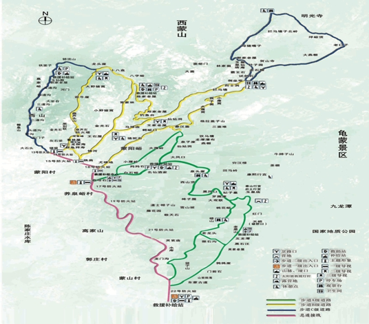 據(jù)悉,蒙山國家登山健身步道項總體規(guī)劃“一線四片區(qū)”:即一條東西縱貫蒙山的步道連線連接龜蒙片區(qū)、云蒙片區(qū)、天蒙片區(qū)、彩蒙片區(qū)四個片區(qū)。一期規(guī)劃建設(shè)龜蒙片區(qū)登山健身步道網(wǎng)絡(luò),步道分A/B/C三級標(biāo)準(zhǔn)路段,五處步道入口,連接6個村鎮(zhèn),輻射周邊百姓1萬余人,包含3處大型救援站,及60公里柏油路連接線。建設(shè)有完善的接待服務(wù)系統(tǒng)、導(dǎo)覽標(biāo)識系統(tǒng)、救援系統(tǒng)、環(huán)保系統(tǒng)、休憩點(diǎn)、觀景臺、衛(wèi)生間、營地等配套設(shè)施。2018年,步道先后被國家體育總局授牌國家登山健身步道-蒙山站,納入國家、山東省優(yōu)質(zhì)體育產(chǎn)業(yè)名錄,并納入了臨沂市“十三五”規(guī)劃。