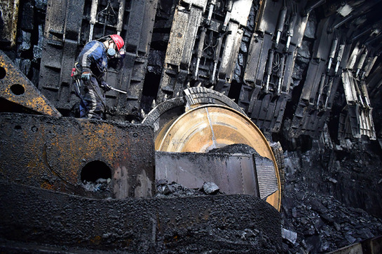 神東煤炭集團上灣煤礦12402綜采面內(nèi),工作人員對采煤機進行檢修。該煤礦新近投用了一批總重量超過萬噸的“鋼鐵巨獸”,用來“一口吞掉”以前需要多次分層開采的特厚煤層,使其在采煤工效、成本、生產(chǎn)能力、生產(chǎn)安全等方面躋身世界一流水準(zhǔn)。神東煤炭集團是中國神華旗下核心煤炭生產(chǎn)企業(yè),由神東礦區(qū)四公司整合而來。記者 邵瑞 攝