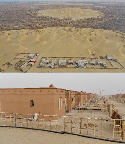 上圖是地處新疆塔克拉瑪干沙漠腹地的于田縣達里雅布依鄉(xiāng)的舊民居;下圖為新疆于田縣達里雅布依小鎮(zhèn)易地扶貧安置點的房屋。記者 胡虎虎 攝
