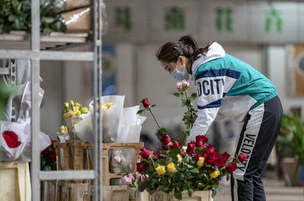 2月26日,當?shù)厥忻裨诙纺匣ɑ芙灰资袌鲞x購鮮花。隨著各地花店陸續(xù)開門營業(yè),物流逐漸好轉(zhuǎn),亞洲最大的鮮切花交易市場——昆明斗南花卉交易市場逐步恢復正常營業(yè)。記者 江文耀 攝