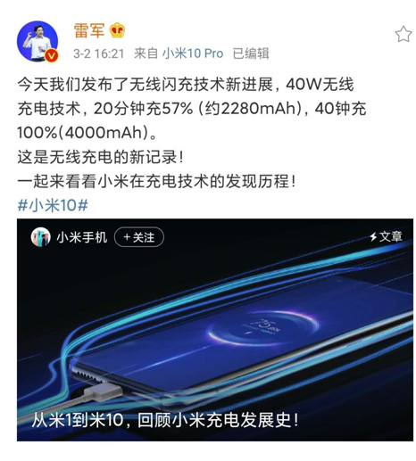 3月2日,小米集團(tuán)創(chuàng)始人、CEO雷軍發(fā)布了自研40W無線+MI-FC閃充技術(shù),同時(shí)在剛結(jié)束的無線充電標(biāo)準(zhǔn)聯(lián)盟(WPC)全會上,小米工程師劉洋成功當(dāng)選聯(lián)盟工作組RWG(Regulation Work Group)聯(lián)席主席,小米成為中國手機(jī)公司里唯一有擔(dān)任主席職位的公司。