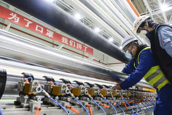 在口罩產(chǎn)業(yè)鏈中,中國石化原本是最上游聚丙烯原料的生產(chǎn)者,為了保障中游熔噴布價格穩(wěn)定和下游口罩產(chǎn)品質(zhì)量和供應(yīng),集團(tuán)公司決定打通產(chǎn)業(yè)鏈,全面介入熔噴布和口罩生產(chǎn)。2月24日,中國石化黨組經(jīng)過兩天緊張調(diào)研后做出決定,投資2億元,快馬加鞭建設(shè)10條熔噴布生產(chǎn)線;3月9日,在第一批自產(chǎn)熔噴布出廠之際,中國石化又宣布,在前期緊急上馬10條熔噴布生產(chǎn)線的基礎(chǔ)上,再增加6條生產(chǎn)線。