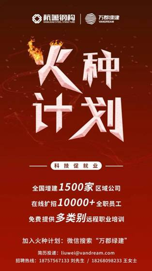 以己之力,積跬步于千里。2020年,萬郡綠建將持續(xù)發(fā)揮自身優(yōu)勢(shì),聚力推動(dòng)全國綠色建筑產(chǎn)業(yè)互聯(lián)網(wǎng)的發(fā)展,加速建筑業(yè)的轉(zhuǎn)型升級(jí)。近期,萬郡綠建全面啟動(dòng)“火種計(jì)劃”,旨在全國范圍內(nèi)建立1500個(gè)銷售管理公司,招募近萬個(gè)崗位,以全國的銷售管理公司為著力點(diǎn),為建筑全產(chǎn)業(yè)鏈供需方企業(yè)提供一站式服務(wù),降低采購成本,提高采購效率,從助力建筑企業(yè)實(shí)現(xiàn)轉(zhuǎn)型升級(jí)出發(fā),推動(dòng)建筑業(yè)向智能化、數(shù)字化發(fā)展。