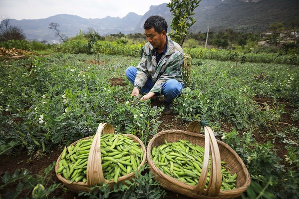 畢節(jié)市黔西縣大關(guān)鎮(zhèn)村民在扶貧基地內(nèi)采摘豌豆。新華社發(fā)(周訓(xùn)超 攝)