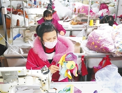 安徽省合肥市廬江縣采取多項措施促進企業(yè)有序復工復產(chǎn),積極組織扶貧車間恢復生產(chǎn),確保當?shù)刎毨艉娃r(nóng)民穩(wěn)就業(yè)、促增收。圖為4月1日,廬江縣廬城鎮(zhèn)鼎輝玩具公司扶貧車間內(nèi),工人正在趕制出口歐美的玩具訂單。