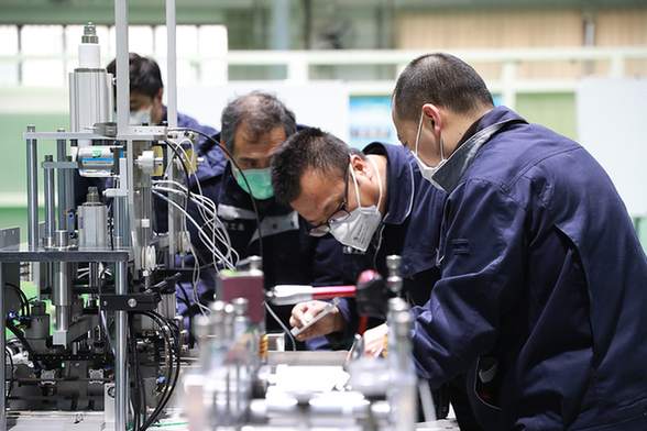 圖為裝配人員聚精會(huì)神調(diào)試設(shè)備。(中國(guó)航空制造技術(shù)研究院 供圖)