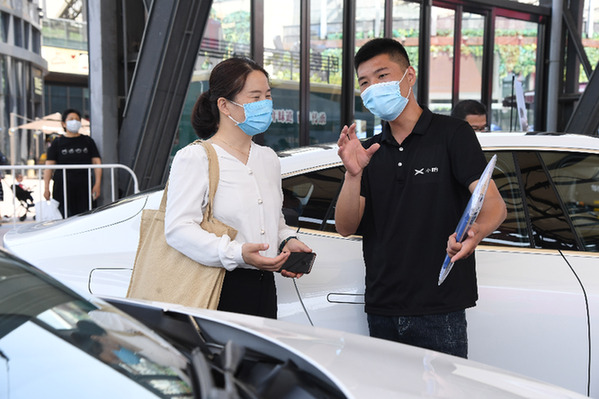6月6日,在北京華熙LIVE·五棵松商業(yè)街區(qū)舉辦的“北京消費(fèi)季之悅動海淀”活動現(xiàn)場,工作人員(右)向市民介紹一款汽車的配置。當(dāng)日,北京消費(fèi)季正式開啟,進(jìn)一步推動北京各行業(yè)復(fù)商復(fù)市,加快實(shí)現(xiàn)消費(fèi)回暖。
