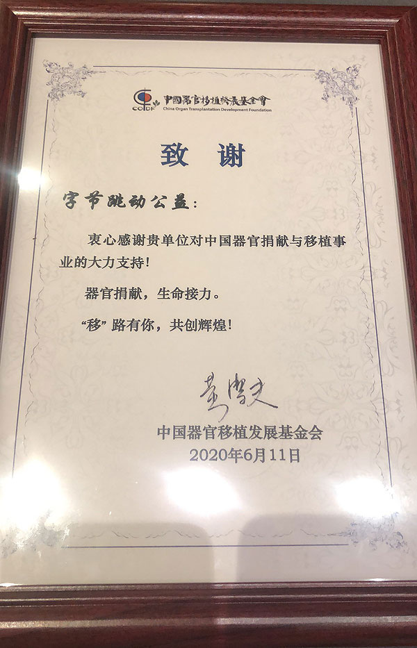 中國器官移植發(fā)展基金會(huì)為本次活動(dòng)中支持中國器官捐獻(xiàn)與移植事業(yè)的公益支持方頒發(fā)感謝狀。(圖片來源:中國器官移植發(fā)展基金會(huì))