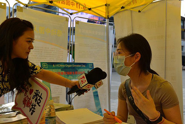 現(xiàn)場(chǎng),器官捐獻(xiàn)志愿登記的市民正在接受記者的采訪。