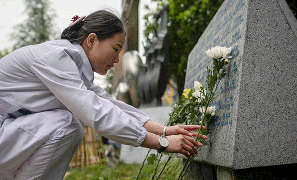 2019年4月3日,醫(yī)務(wù)工作者代表在活動(dòng)現(xiàn)場向捐獻(xiàn)者紀(jì)念碑獻(xiàn)花。 新華社記者江文耀攝