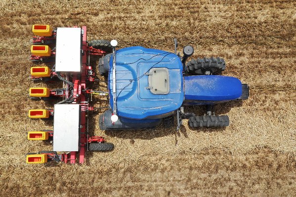 在河南省鄧州市小楊營(yíng)鎮(zhèn)安眾村,加裝有北斗導(dǎo)航系統(tǒng)的拖拉機(jī)在無(wú)人駕駛狀態(tài)下播種。