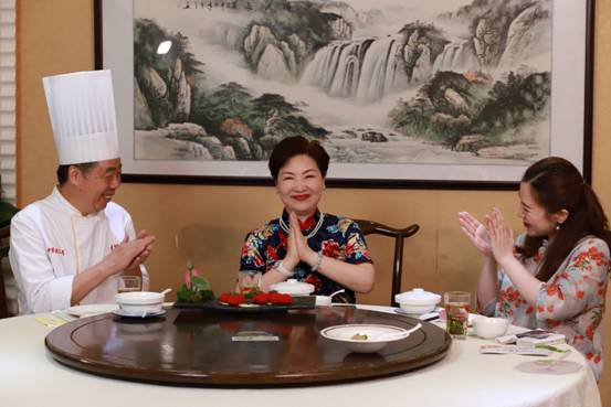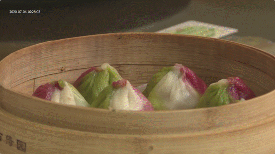 游園環(huán)節(jié)之后,主持人來到了園林旁邊的上海古猗園餐廳。著名說唱演員、國家一級演員顧竹君老師已在餐廳等候。在李建鋼師傅的招待下,顧竹君和主持人一道品嘗了傳統(tǒng)小籠和多種色彩繽紛的創(chuàng)新小籠?;瘕埞{(diào)為紅色,菠菜調(diào)為綠色,蓮藕、黃瓜紛紛入餡……歷史悠久的南翔小籠正在不斷創(chuàng)新。