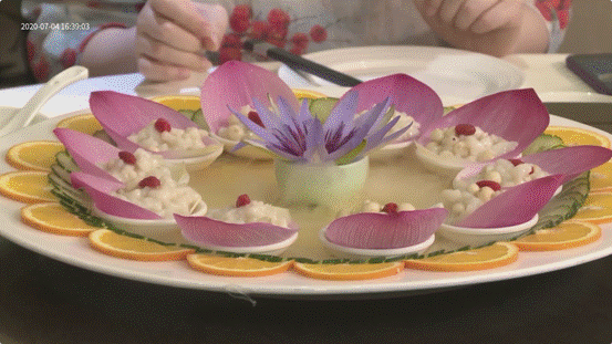 此時正值古猗園舉辦荷花展,餐廳推出了飽含荷花元素的“荷花宴”。“楊梅時節(jié)”“雙魚戲荷”“秋葵大黃魚”“金湯芙蓉球”“蓮花魚米盞”等幾道菜肴被端至嘉賓面前。先于味覺感受的是視覺美,幾道菜肴引得直播間的網(wǎng)友大流口水。在品嘗菜肴的間隙,節(jié)目還“混搭”了一款雪糕——頗具人氣的“鐘薛高”。鐘薛高是來自南翔的企業(yè)之一,其瓦片狀的外形極具中式美,精選原料制成的雪糕讓這家創(chuàng)立于2018年的企業(yè)快速成長為“新國潮”。